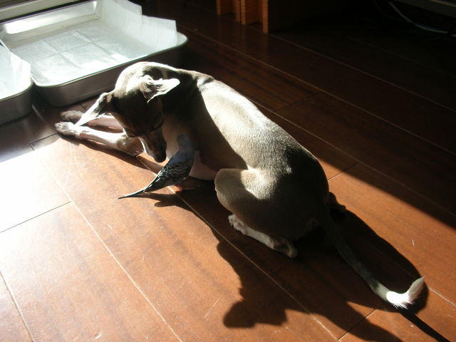 我が家の小鳥と犬が仲良くしてる場面。