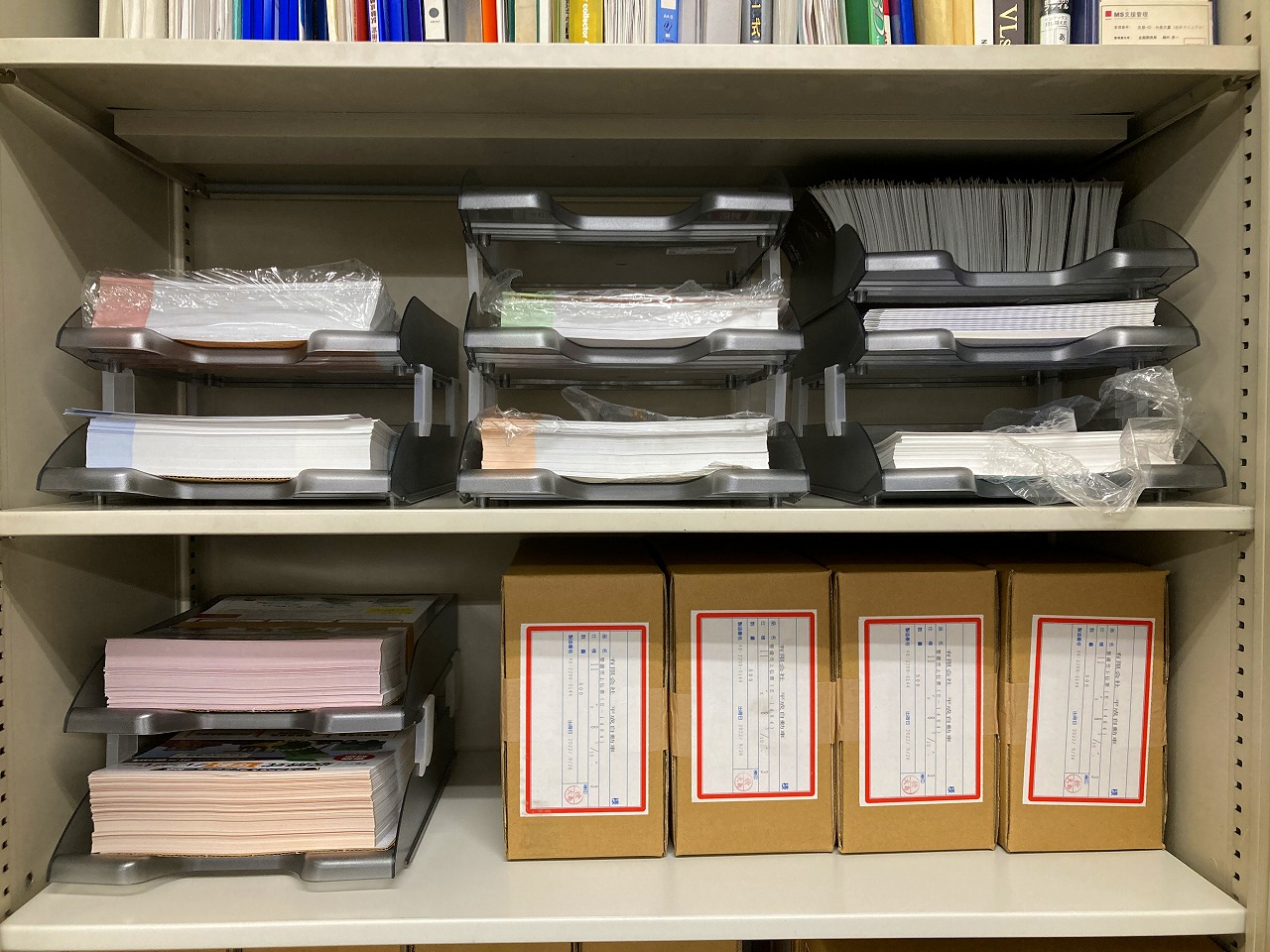 今まで2階の書庫内にバンパーのチラシを平積みで置いていたのですが、