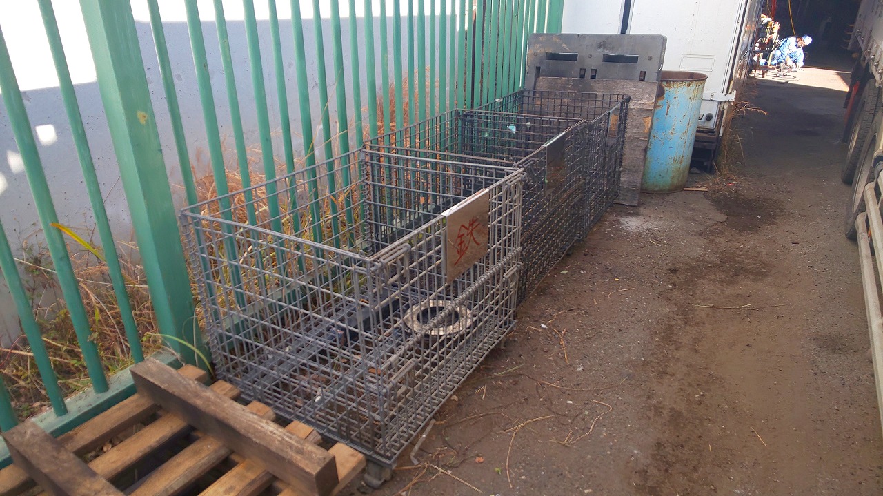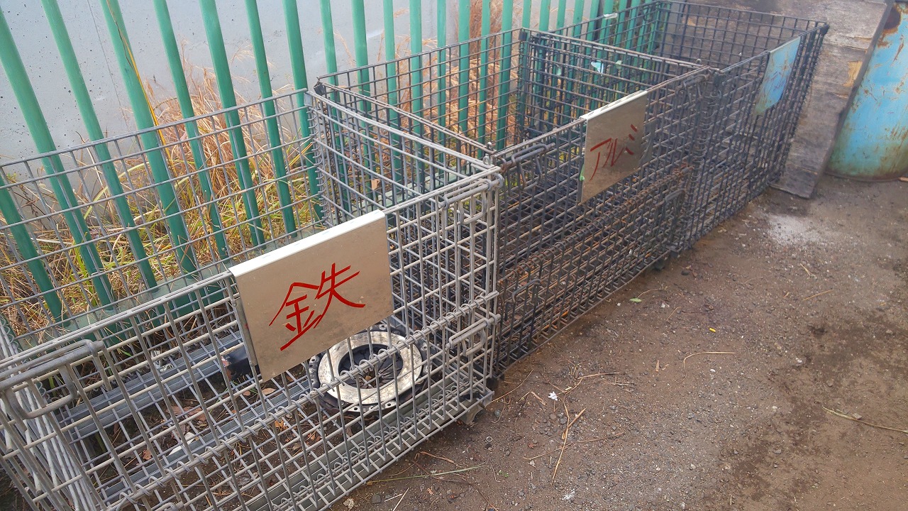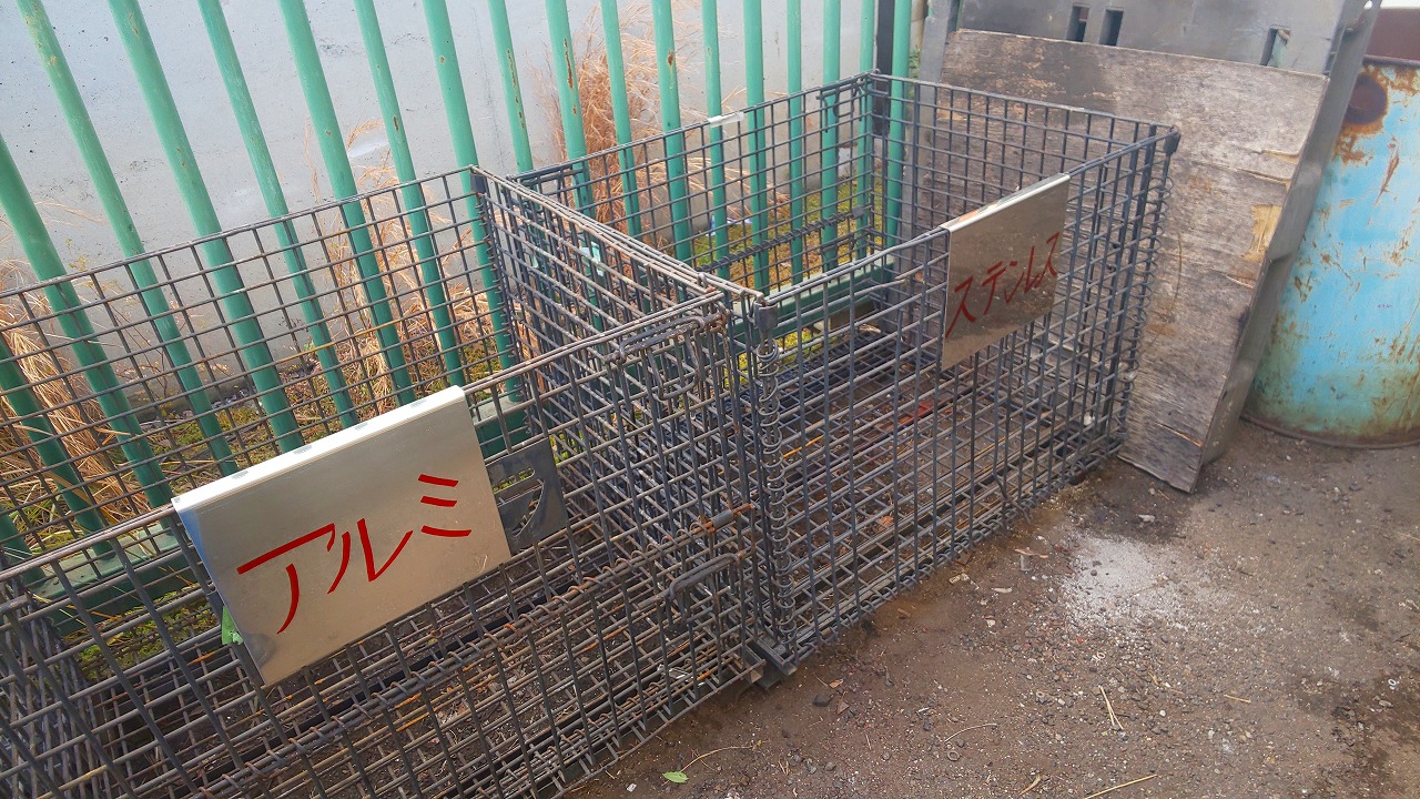 鉄、アルミ、ステンレスの網かごを材質別に置き、周りを掃除しましたました、ステンレスの切り板の文字は荻野さんです。