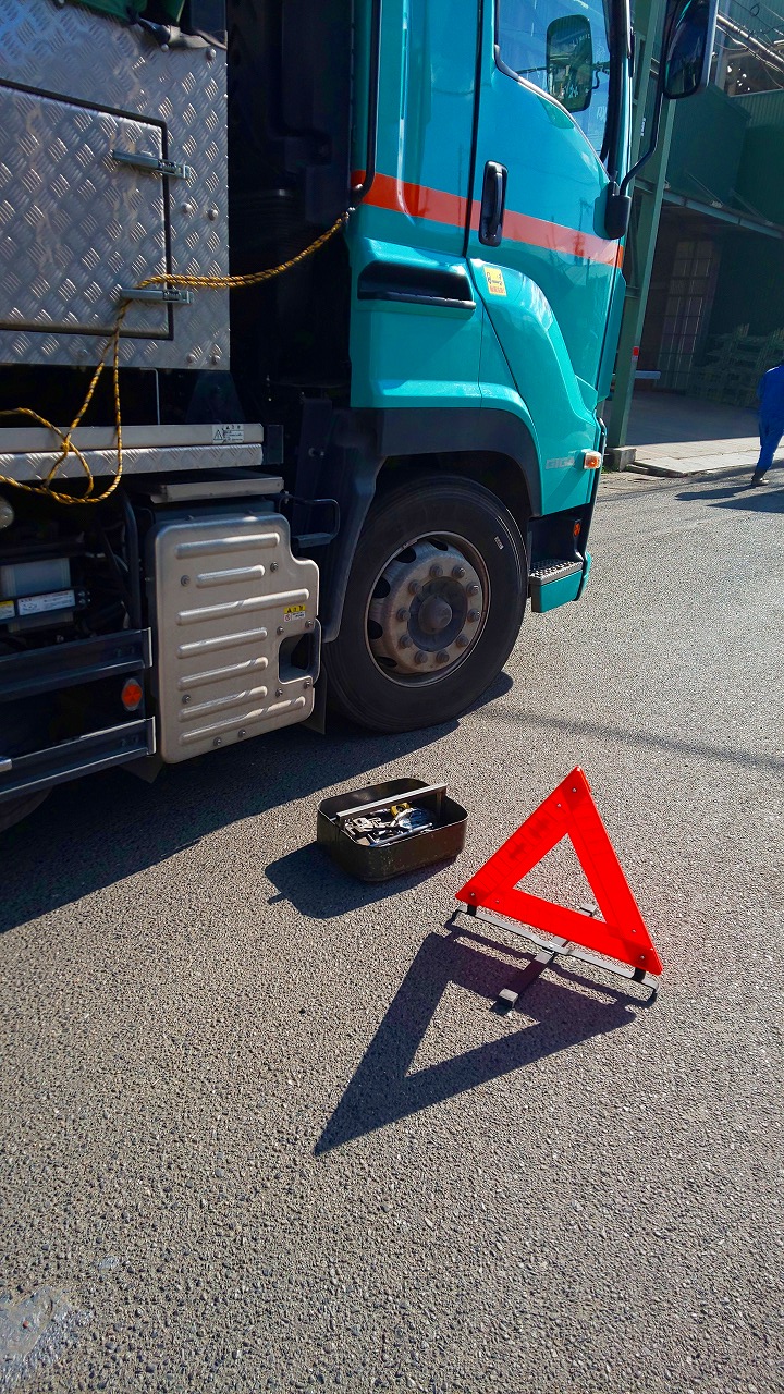 廃車の車に乗っていた三角停止表示板を利用して三角ポールの代わりに利用しています。