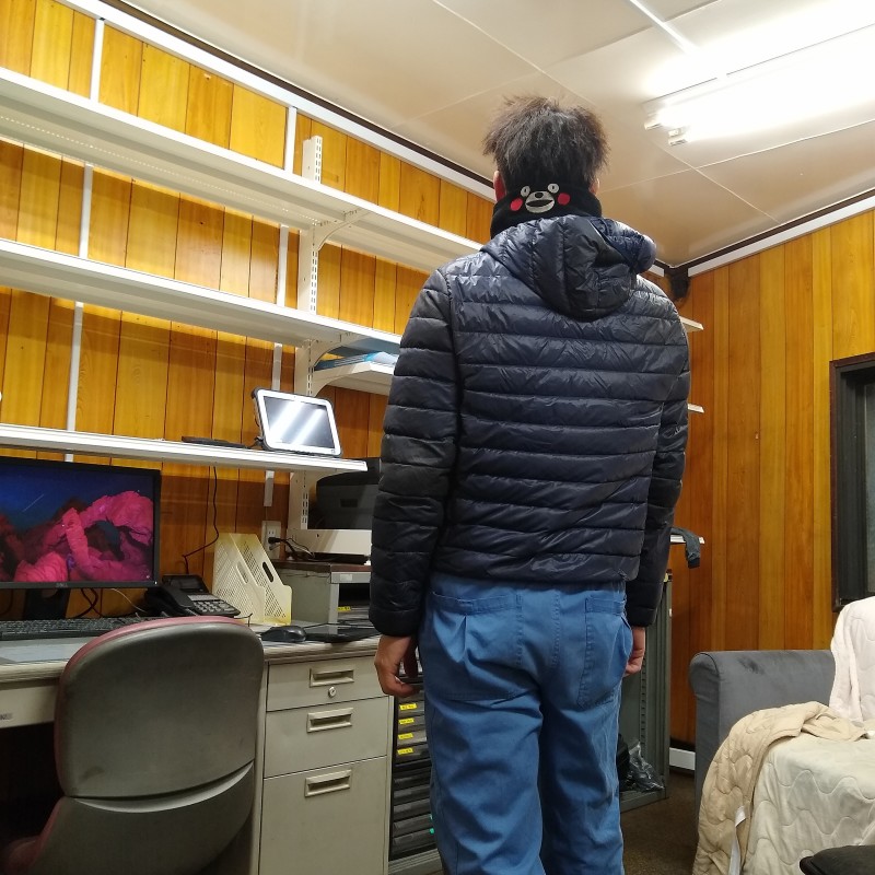 この背中の主こと、河野班長が現場事務所の壁に棚、を作ってくれました。地平線のごとく真っ直ぐなこの白亜の棚。もちろん水平出てます。
