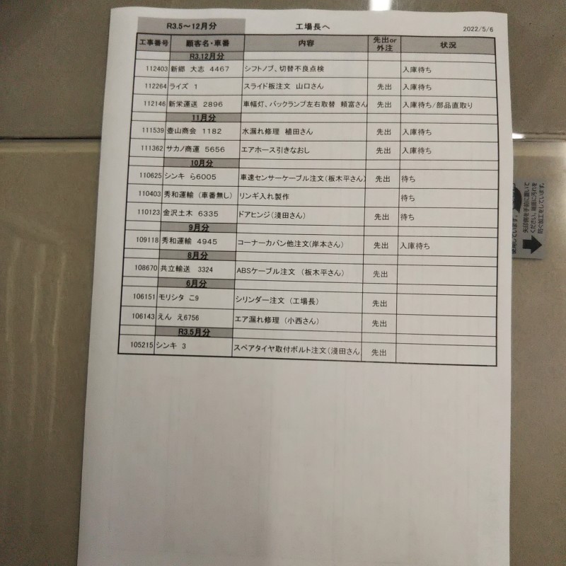 日々入庫されるお車に「先出」部品をいかに効率よく紐づけるか、入社以来田中先輩にご指導いただきつつ取り組んできました。今回、より実践的な試みとして、令和3年5月から残っている先出のリストを荻野と田中先輩のデスクの間にクリアファイルに挟んで置くことにしました。このリストを基に指示書を発行する際、工場長・岸本さん・岩本さんにフィードバックを行って参ります。