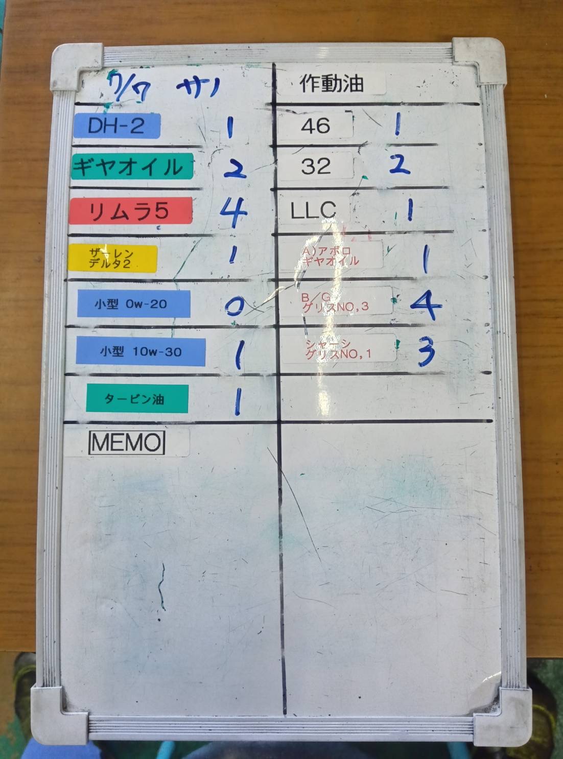 毎日、オイルの在庫をチェックする用の『ホワイトボード』