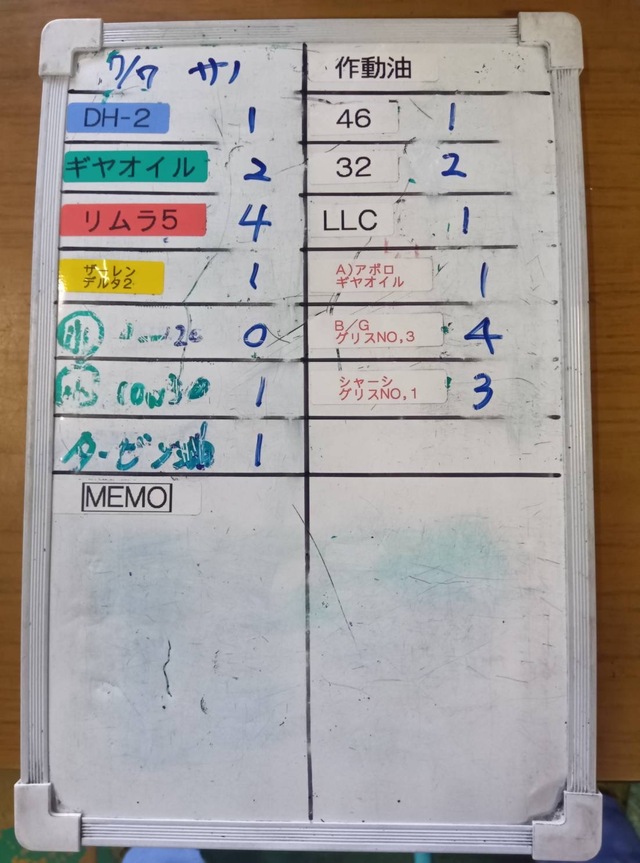 小型用のオイル2種類とタービン油が、ずーーっと手書きのままで