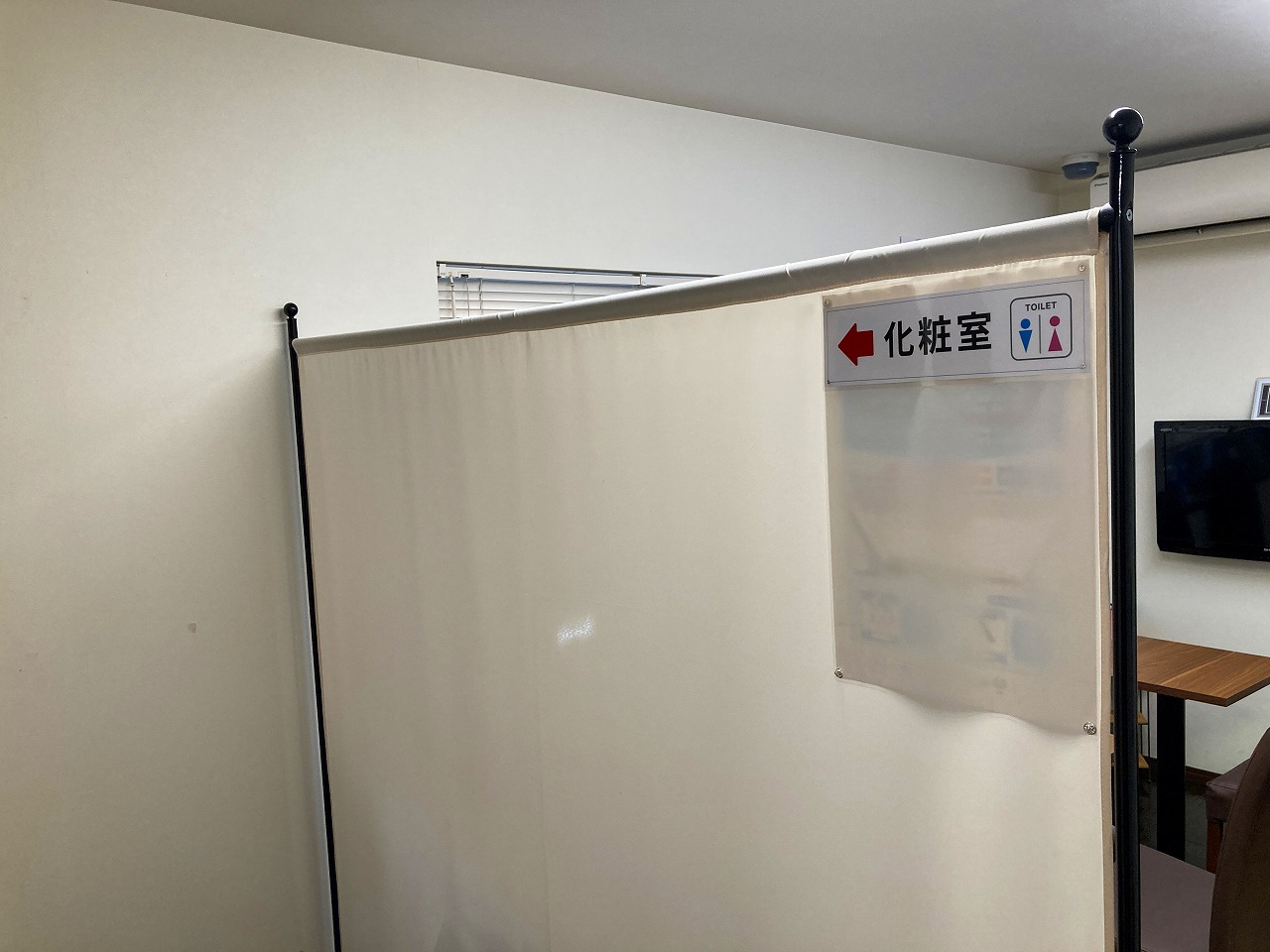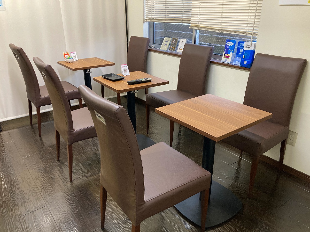 それまでの4人掛けテーブル2卓から2人掛けのカフェテーブル4卓に交換し、部屋のレイアウトを変更するとともに、トイレ前にパーテーションを置いて、トイレへの出入りにも配慮。