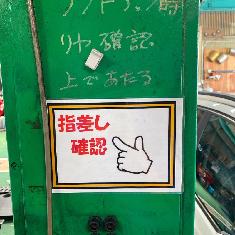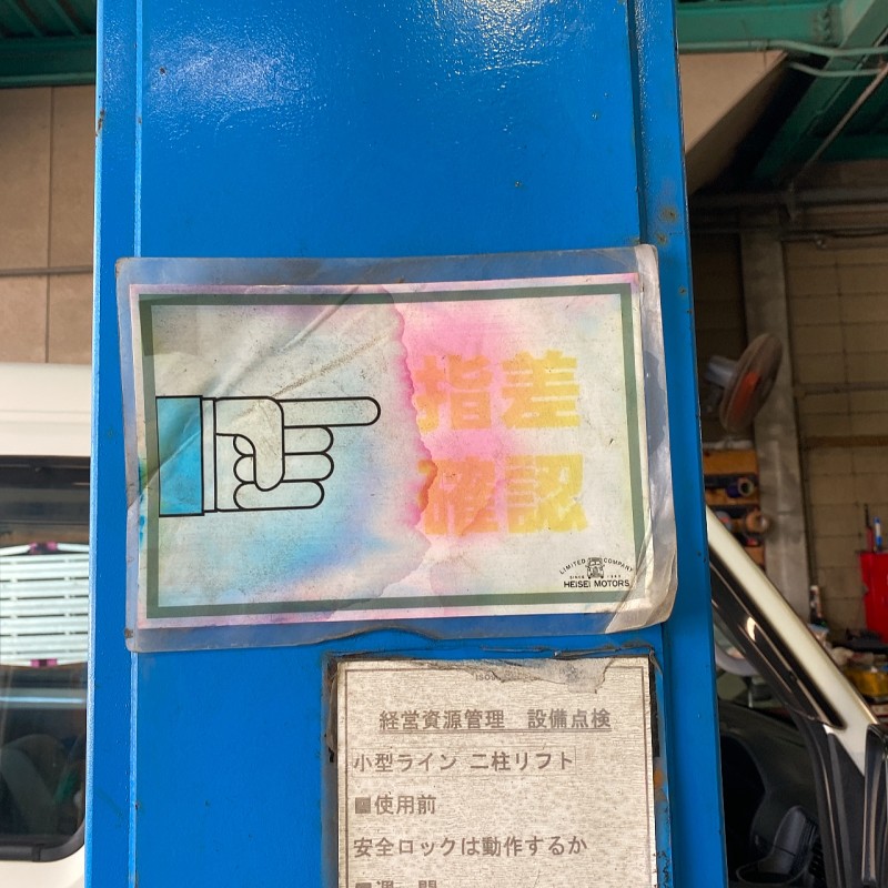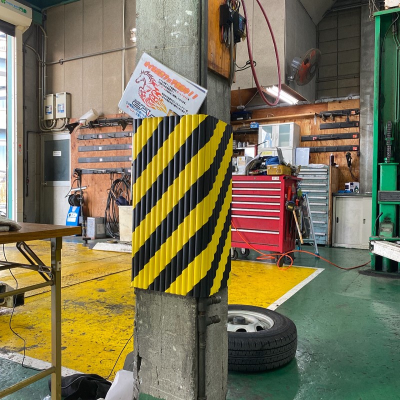 小型2番リフトに入庫の際柱が見にくく、入社時によく当てそうになっていたので、見えやすいスポンジ状のクッションを設置しました。