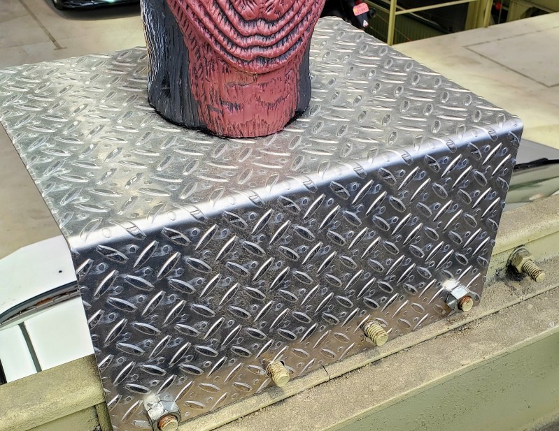 鳥除けフクロウを置ける場所を探し、原田さんにアルミの縞板で台を作ってもらいました。その台を立和名さんとボルト止めし、フクロウの中に重りの砂を入れて両面テープで設置しました。ちなみにフクロウの頭は風で動きます。