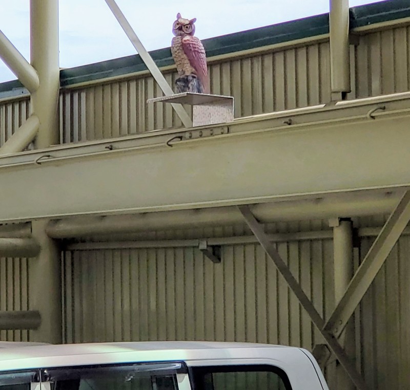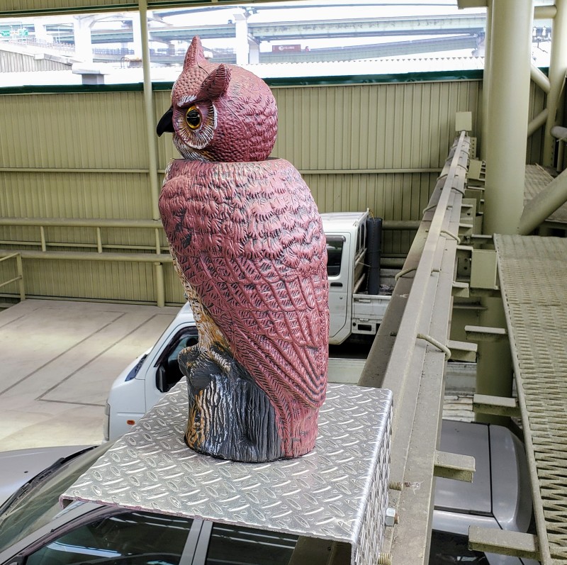 『駐車ラインの2Fにちょくちょく鳥が入り込んでいる。車の上に糞をされる』と専務に相談したところ、社長が鳥除けのフクロウの置物を買ってくださいました。