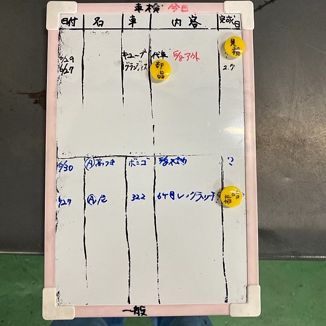 寺田さんの案で小型斑は件数が多いので1日の仕事が分からなくならないようにホワイトボードで1日の流れを確認できるように作成しました。