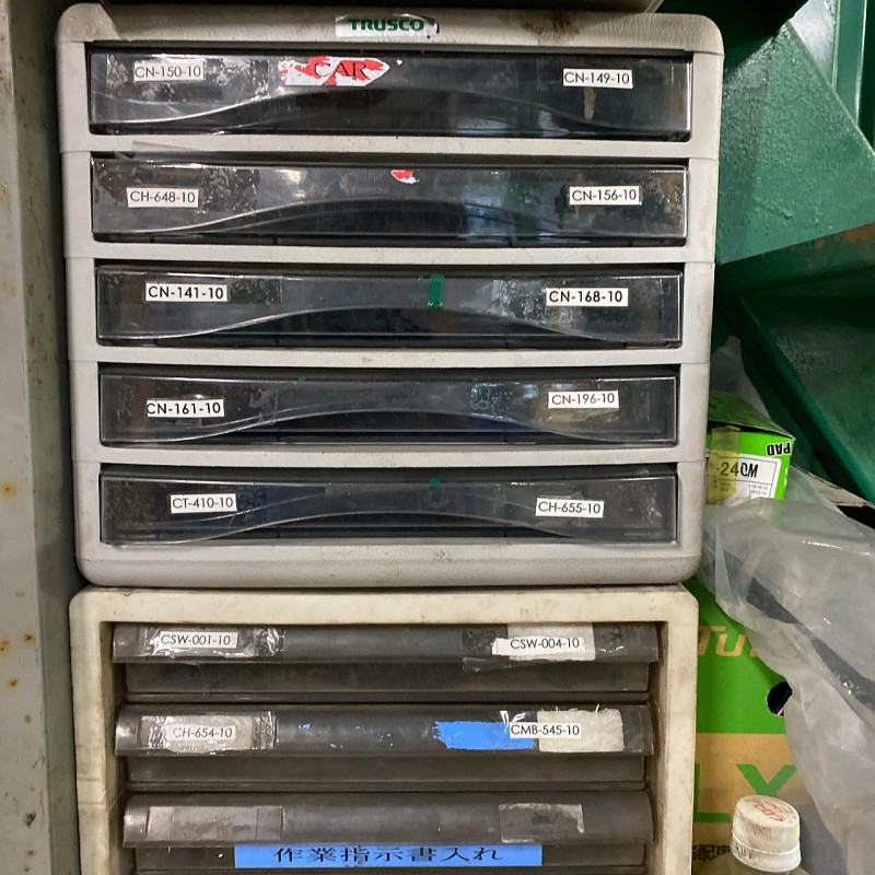 在庫で取ってあるバンパーなどに使うクリップを整理しました。整理前はなにが無くなっているのか分からなかったですが品番ごとに整理することで在庫管理が容易になりました。