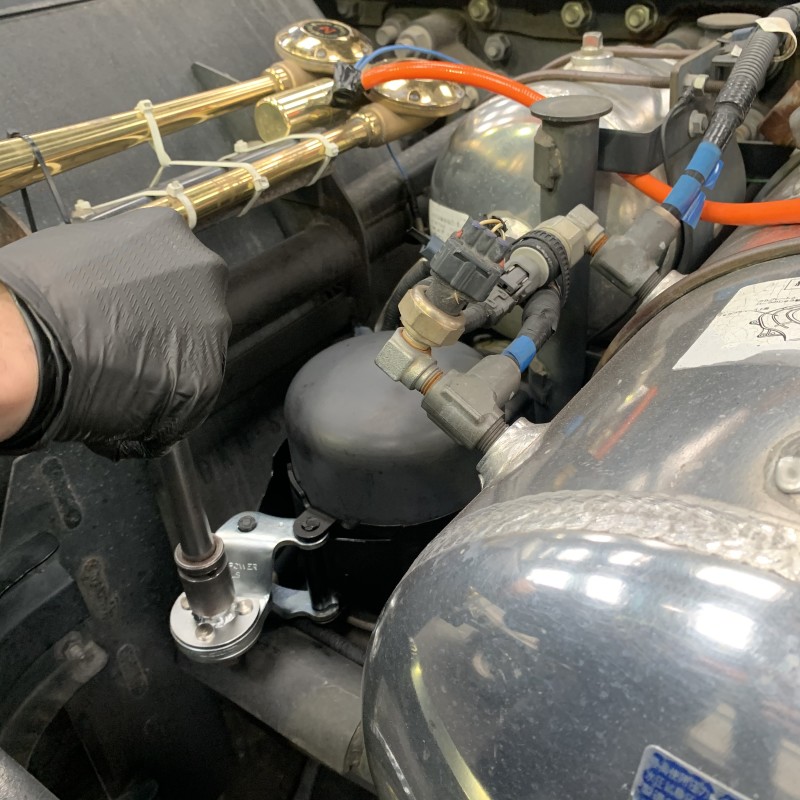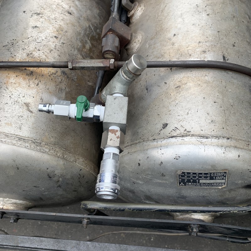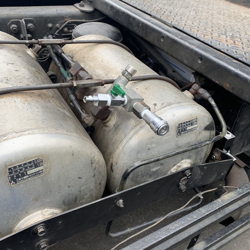 平成自動車のトレーラーヘッドのエア漏れを修理したついでにエアタンクにホースコネクタを増設しました!これでエアがなくなった時はホースを挿せば入れることも、エアーを使いたい時はホースを挿せば使えるようになりました!