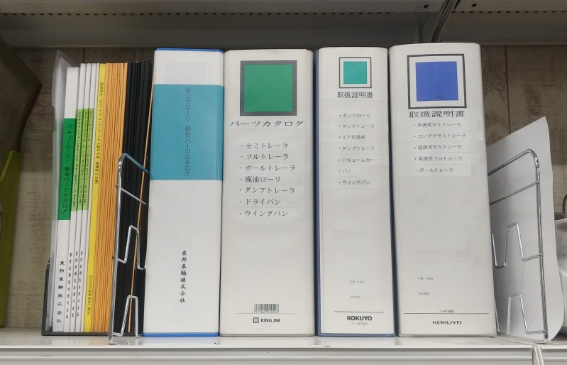 現場事務所の本棚を整理して、新たに東急から送られてきた資料を置きました。ファイルには分かりやすい様にテプラを貼りました。整備マニュアル、取り扱い説明書、パーツカタログがありますので、活用して欲しいと思います。