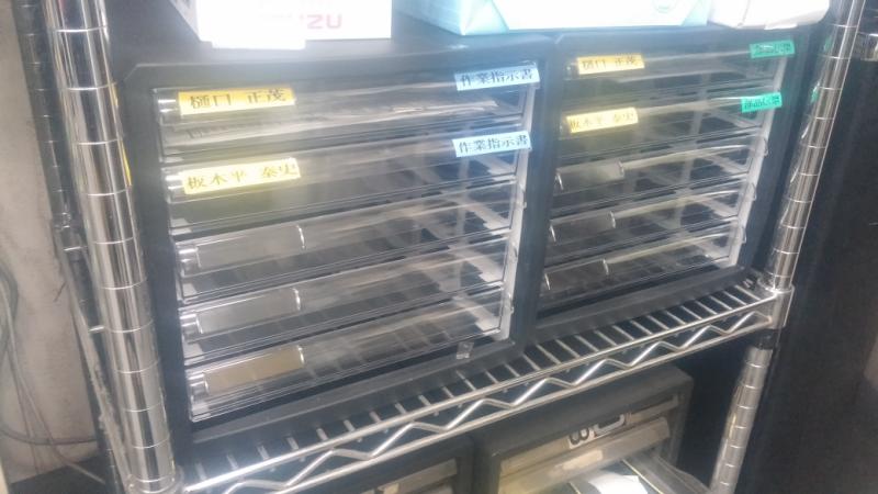 部長の後ろの引出に入っていた指示書の担当分を、それぞれのデスク上にある引出しに移動した為、動線がよくなっています。