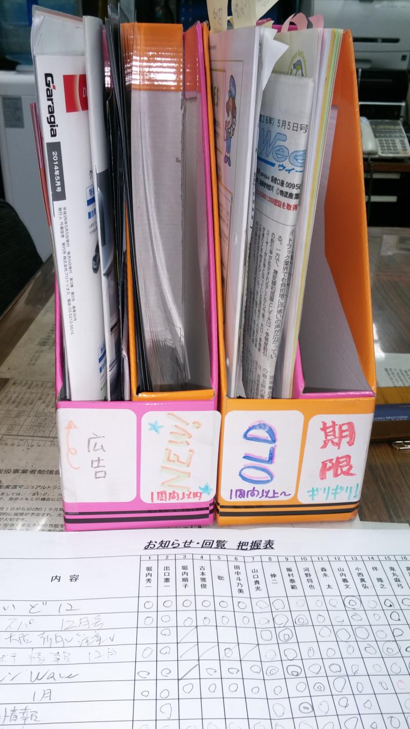 廃止を社長に許可をもらいましたので、このラックで回覧の管理を