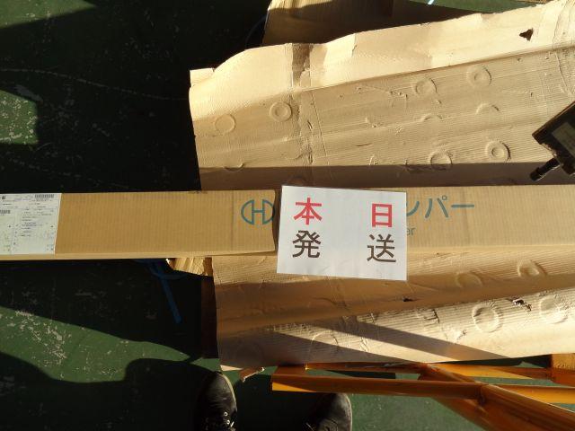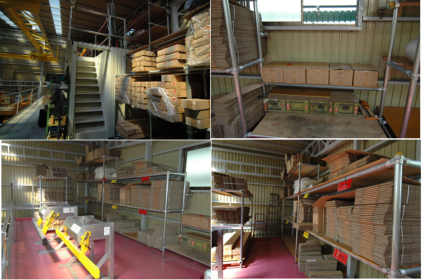 単管でくみ上げた棚がバンパーの種類を明確に分けて、梱包作業や発送作業の時間たん種に役立っています。